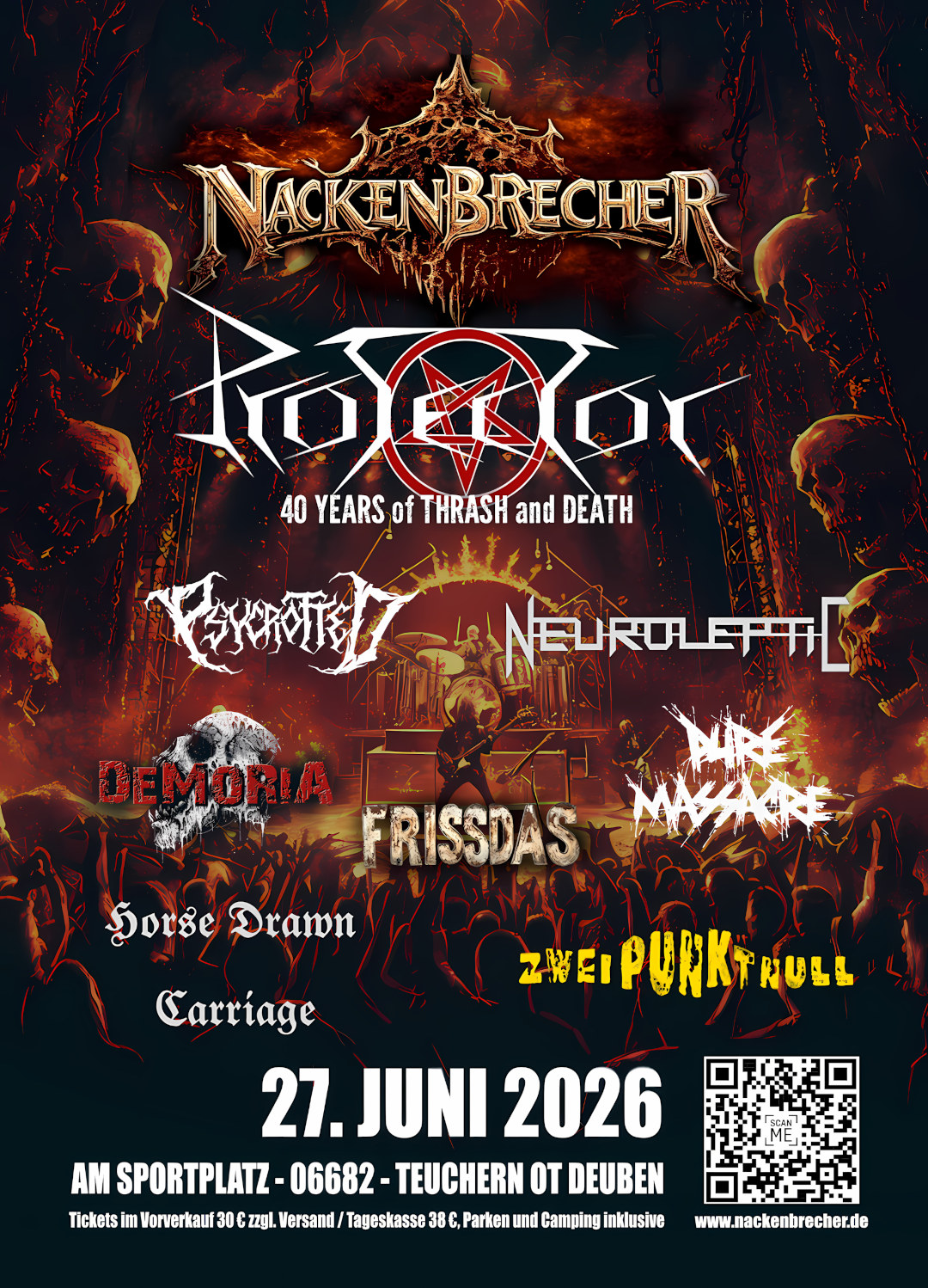 Am 27. Juni 2026 bebt Teuchern bei Leipzig: Freut euch auf einen Tag voller brachialer Riffs, donnernder Drums und purer Festivalenergie. Ob Underground-Legenden oder aufstrebende Metal-Acts – hier trifft rohe Energie auf familiäre Atmosphäre. Sei dabei, wenn die Hölle auf Erden ein Zuhause findet!