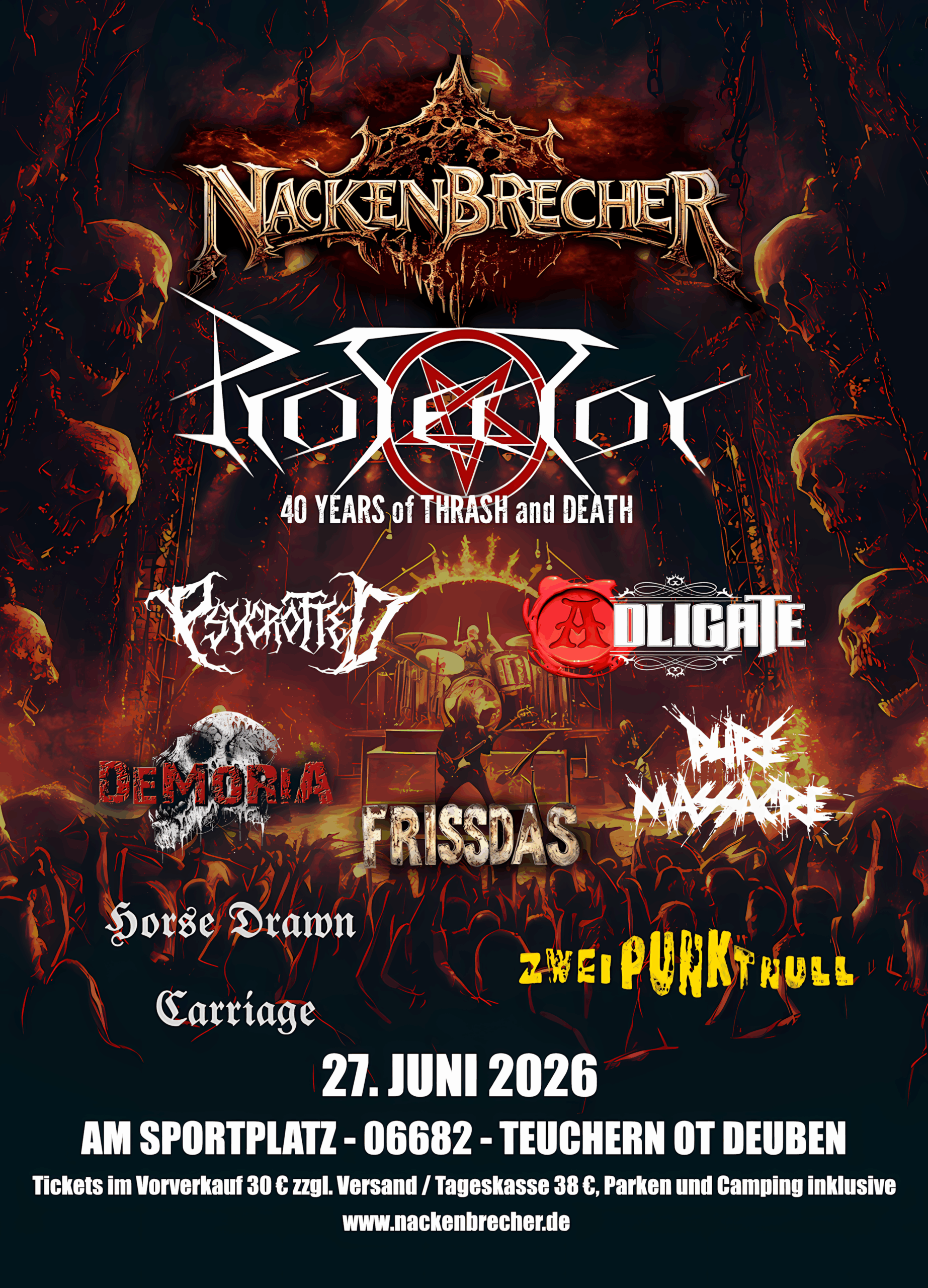 Am 27. Juni 2026 bebt Teuchern bei Leipzig: Freut euch auf einen Tag voller brachialer Riffs, donnernder Drums und purer Festivalenergie. Ob Underground-Legenden oder aufstrebende Metal-Acts – hier trifft rohe Energie auf familiäre Atmosphäre. Sei dabei, wenn die Hölle auf Erden ein Zuhause findet!